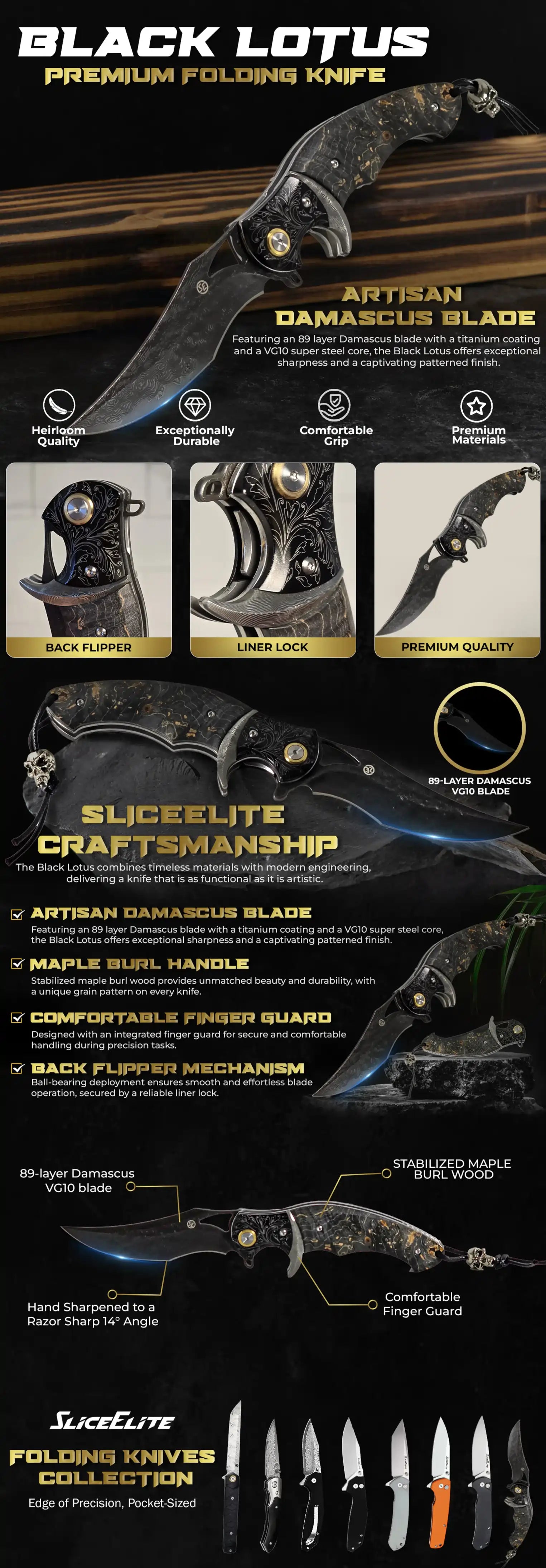 Black Lotus Folding Knife Damascus VG10 Blade Maple Burl Wood Handle