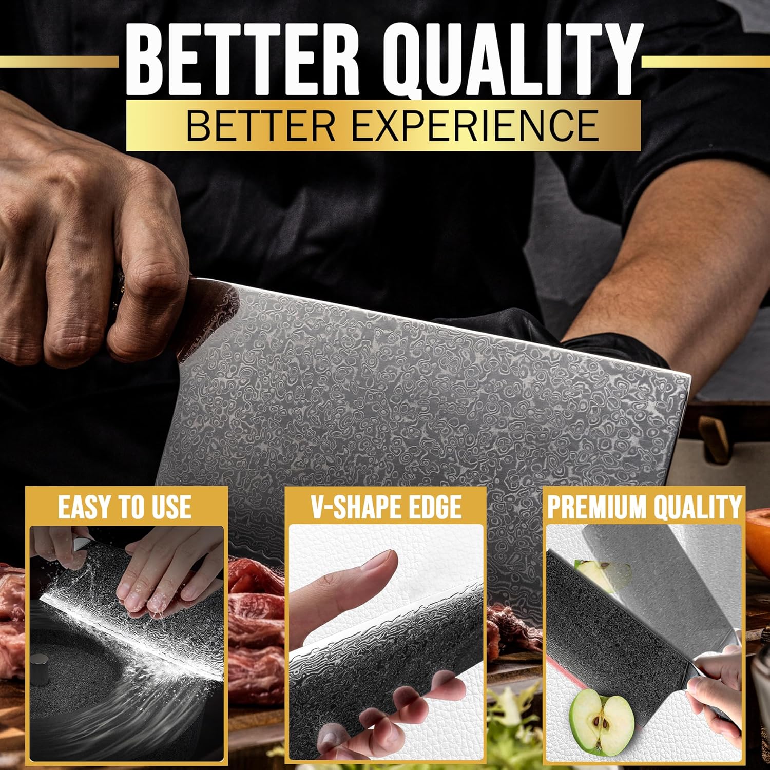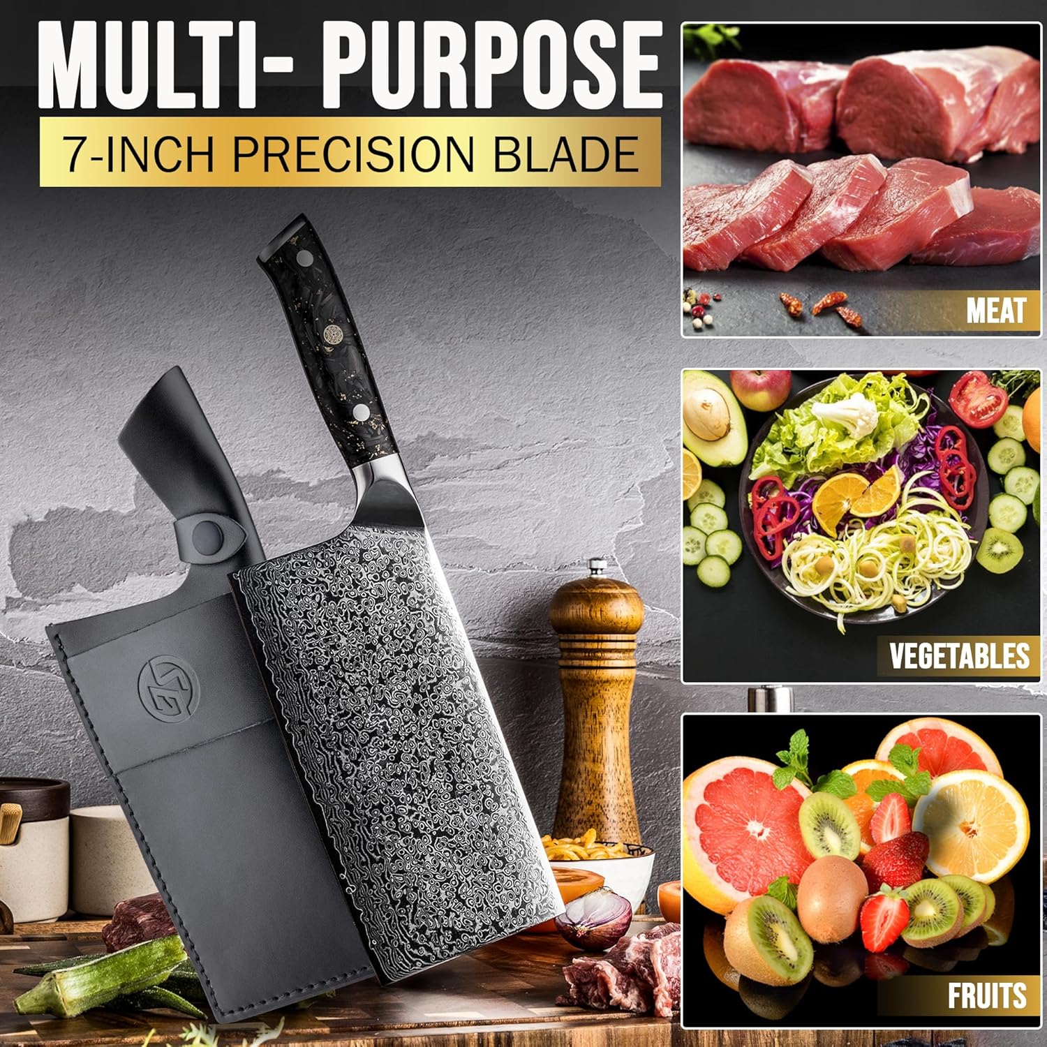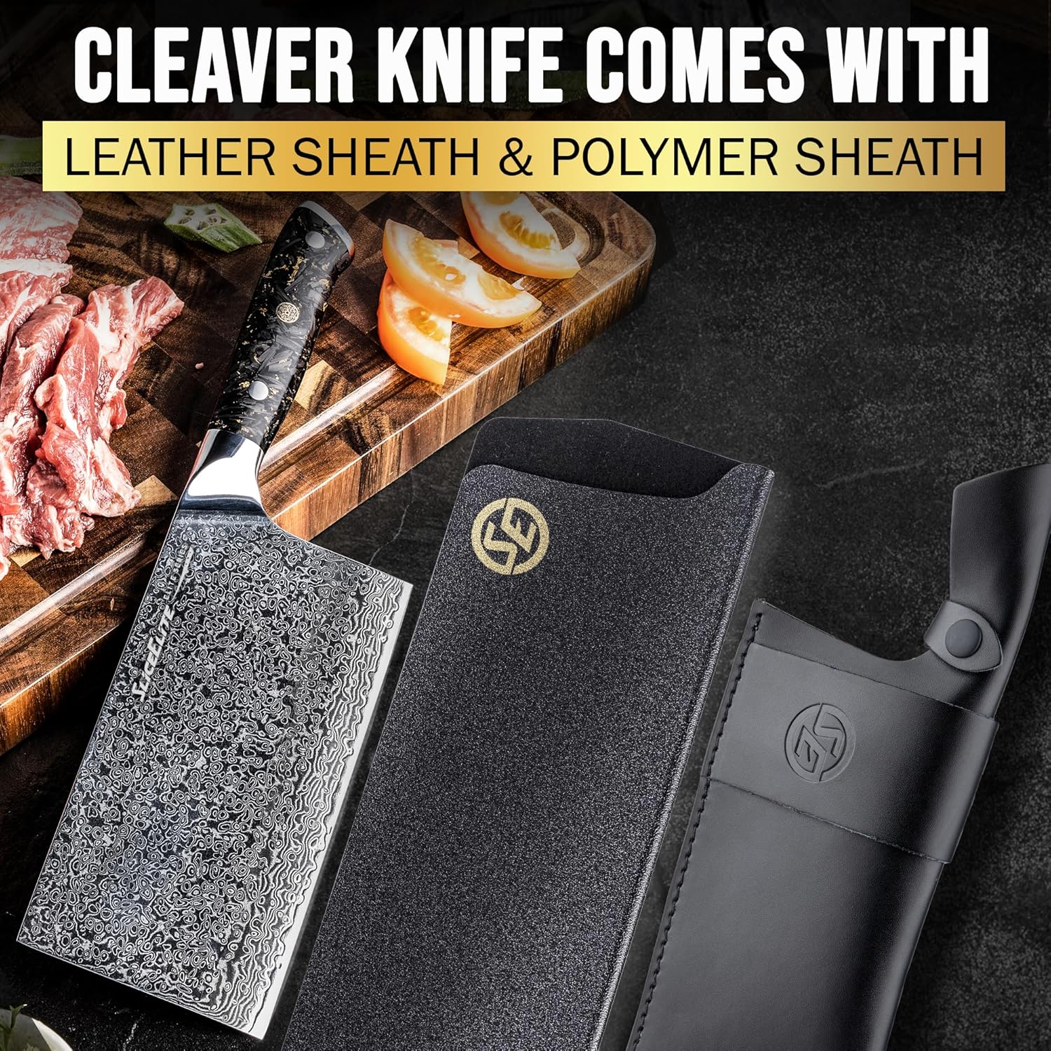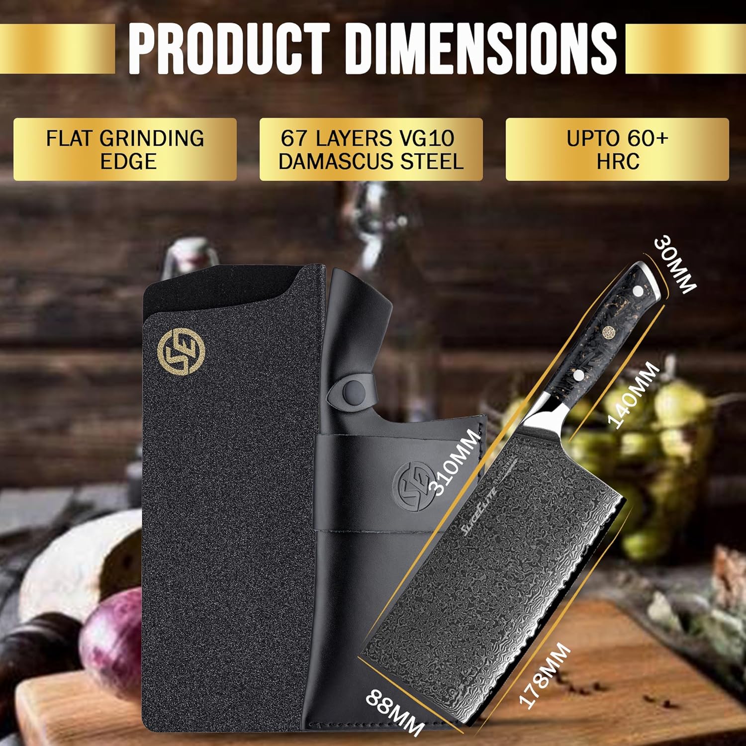 Elite Series 7-Inch Meat Cleaver Knife –Damascus Steel VG10 Core Carbon Fiber Handle with Dual Sheath Polymer & Leather | Meat and Vegetable Knives | Butcher Knife for Meat Cutting & Chopper