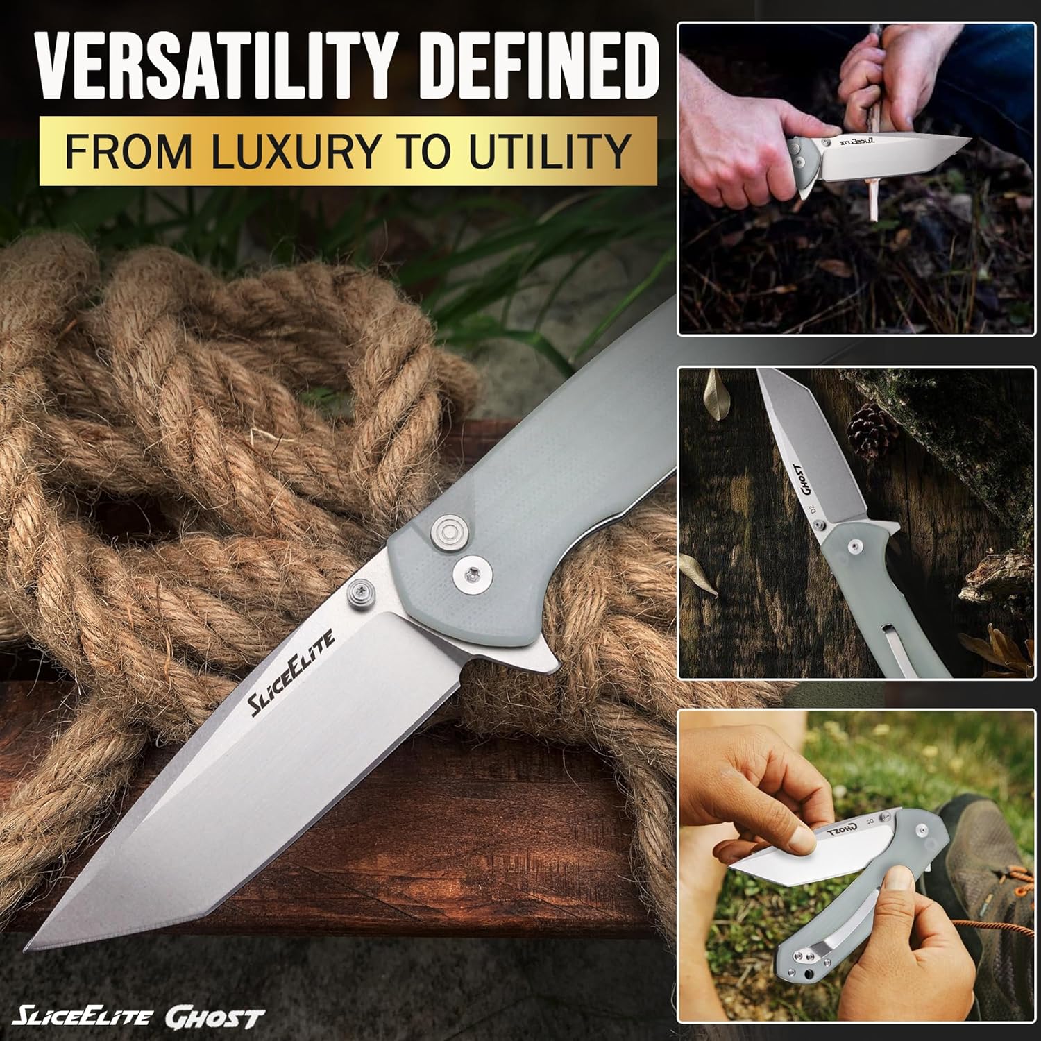 Ghost EDC Knife 3.4 Inch D2 Steel Tanto Blade Translucent Green G10 Handle Button Lock Stainless Steel Pocket Clip Lightweight Compact Everyday Carry Knife