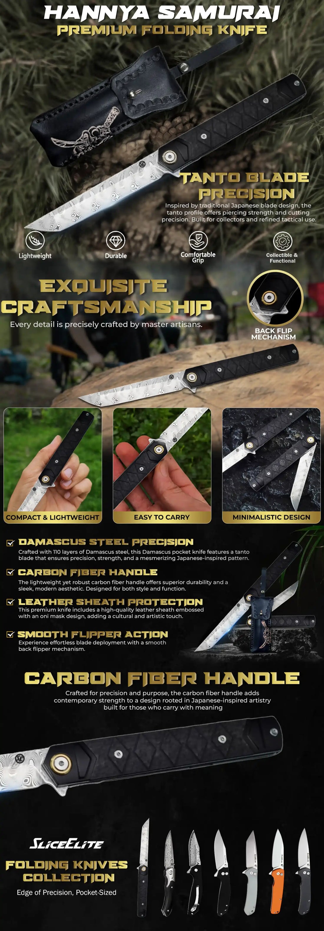 ✅𝐒𝐋𝐈𝐂𝐄𝐄𝐋𝐈𝐓𝐄 𝐂𝐑𝐀𝐅𝐓𝐒𝐌𝐀𝐍𝐒𝐇𝐈𝐏: A fusion of Japanese-inspired craftsmanship and premium materials, this high-quality knife brings precision, quality, and elegance to your collection. Designed with enthusiasts in mind, it embodies the high standards of SliceElite, offering both sophistication and durability in a compact, practical form.