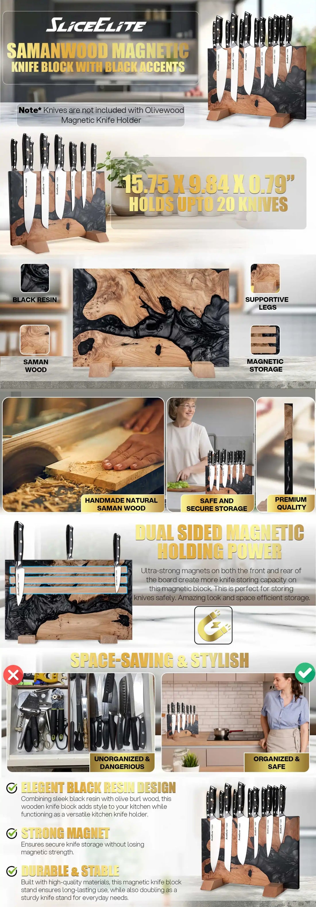 SliceElite Magnetic Knife Block East Indian Walnut Blue Resin Holds 20 Knives